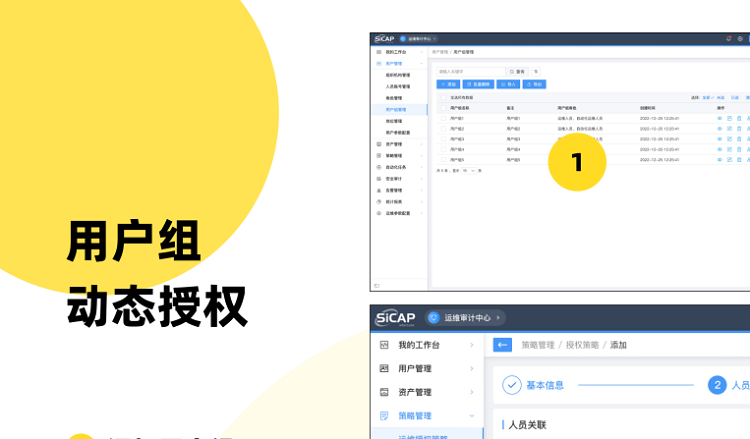 SiCAP支持将相同操作权限的人员设置为同一个用户组,为用户组分配相应的权限,建立基于“用户组”的动态授权关系,当用户组添加、删减人员时,该人员自动拥有或解除用户组对应的授权。