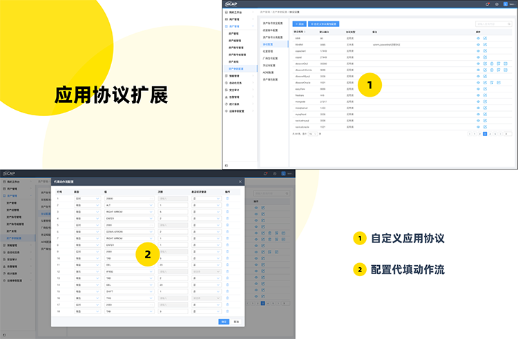 用户通过可视化页面可以灵活自定义数据库、C/S、B/S 客户端的属性配置,从而实现广泛的应用协议接入;无论何种协议,均可通过模拟用户键盘操作、属性参数化等,进行协议动作流代填,实现资源的自动登录与运维、审计。