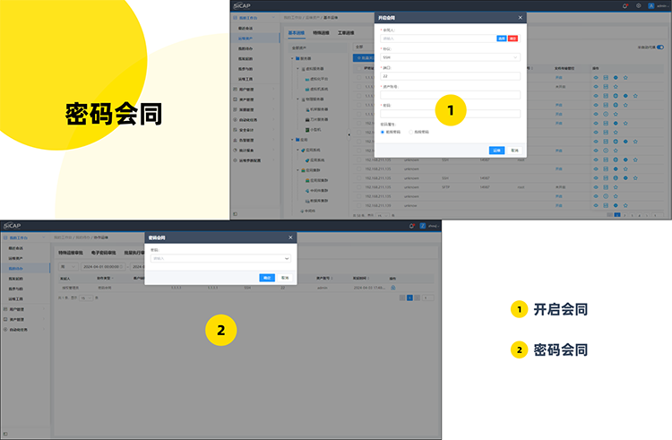 SiCAP-OMA提供密码会同功能。在运维发起阶段,由运维人员输入自己保管的部分密码,再由会同人输入剩余密码,汇总得到完整的密码,完成资产的访问,实现协同操作、相互监督,保证信息安全。