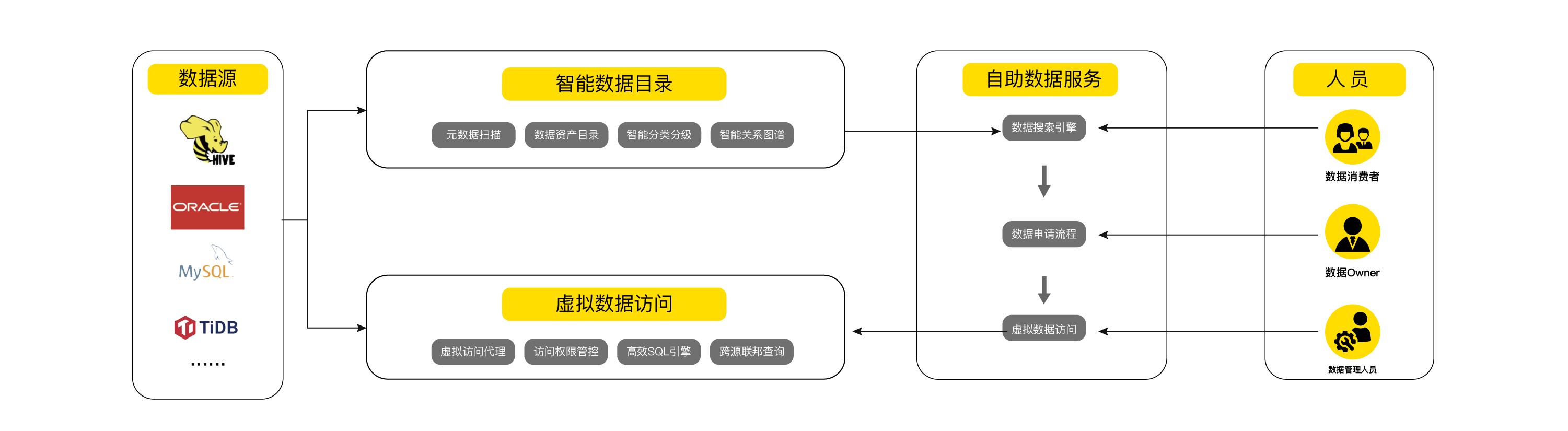 数据智能平台基于数据编织架构实现组织内部数据孤岛的逻辑连通,通过建立全局数据资产目录和虚拟数据访问代理为数据消费者提供统一的数据搜索和访问入口,为组织构建安全合规的数据使用和管理流程。