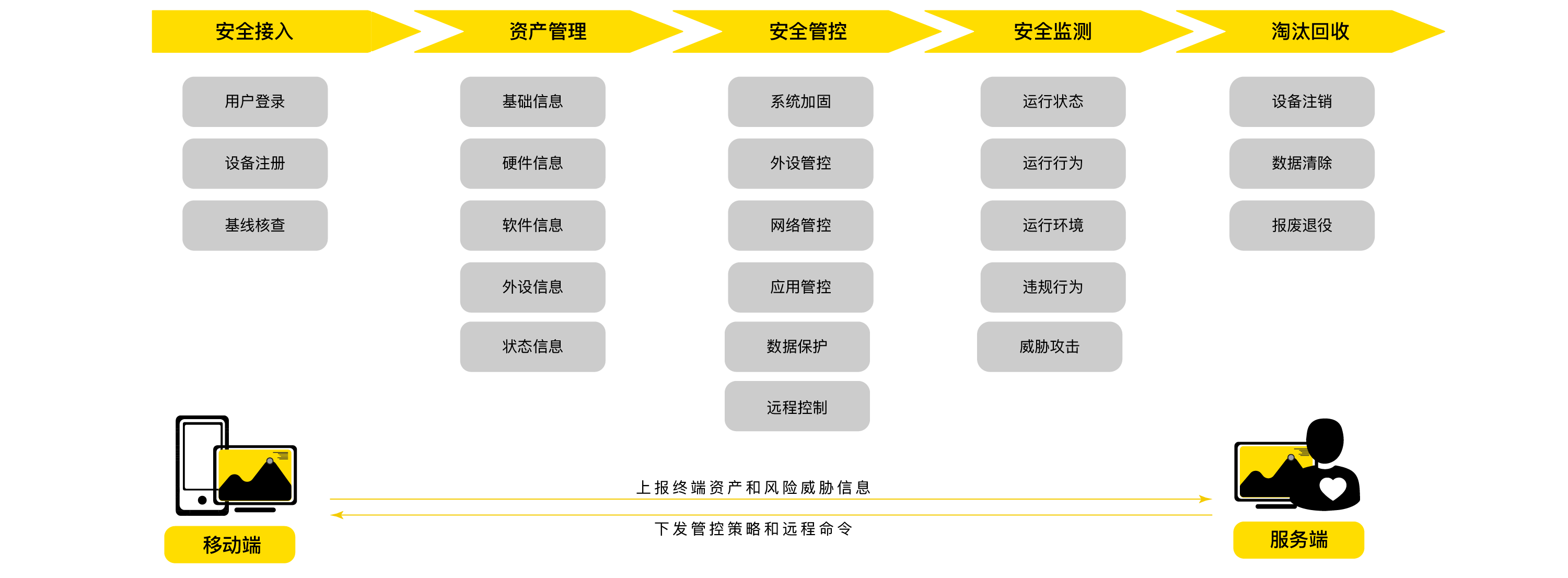 通过设备资产管理、设备安全管控和设备合规检测,结合灵活的策略配置、细粒度的管控措施和多种远程控制命令,实现移动设备从部署安装、注册使用到淘汰回收的全生命周期管控,保障企业移动业务安全高效开展。