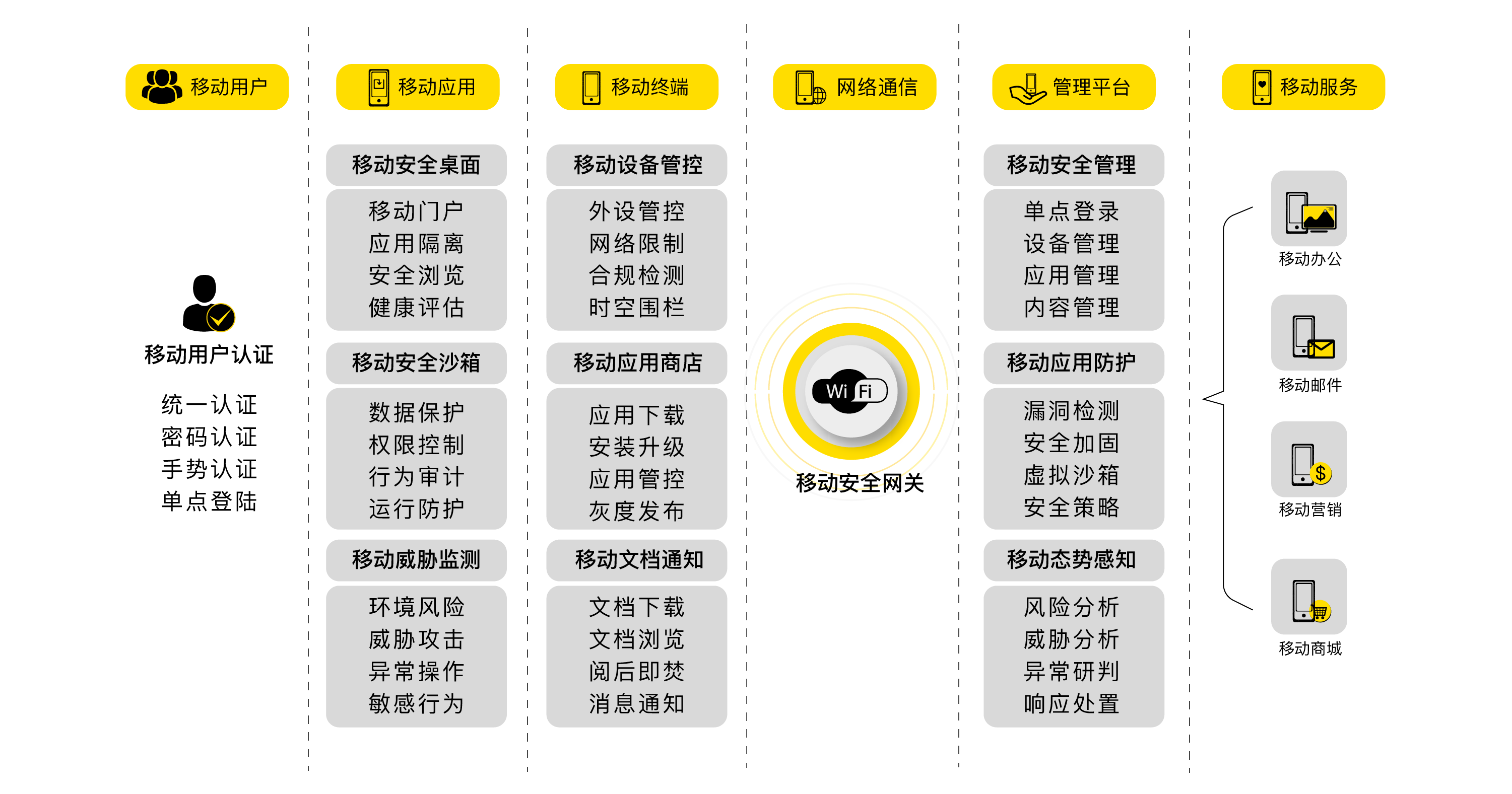 移动安全管理平台,以企业移动安全桌面为载体,通过移动设备安全管控、移动应用安全防护、移动威胁安全监测、移动内容安全管理和管理平台基础服务等功能,形成一站式企业移动安全解决方案。