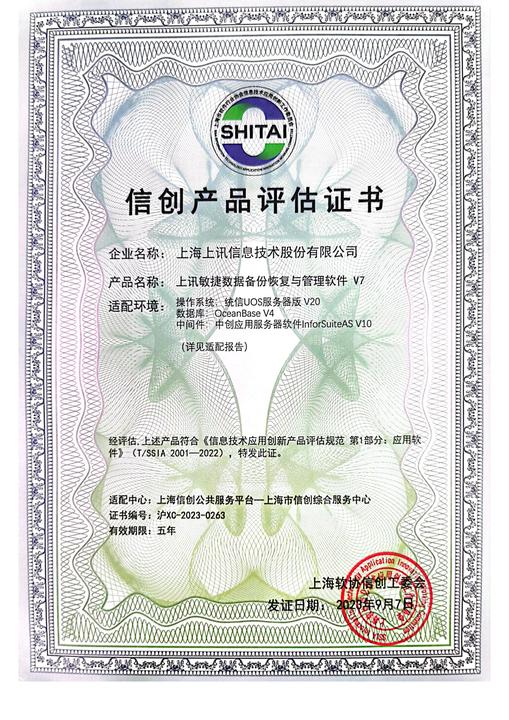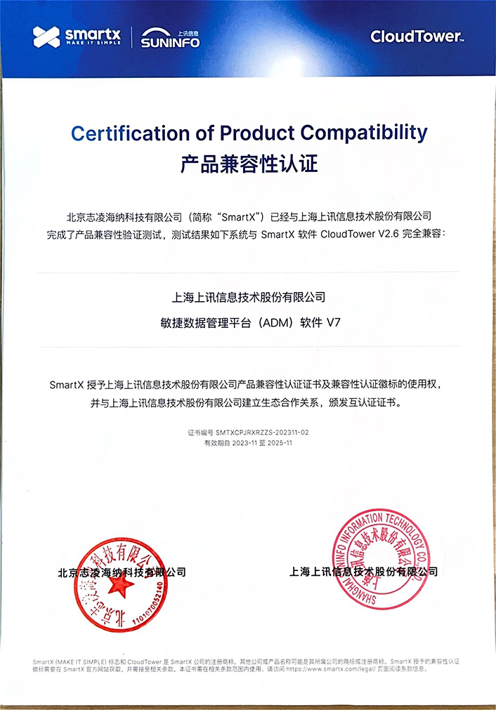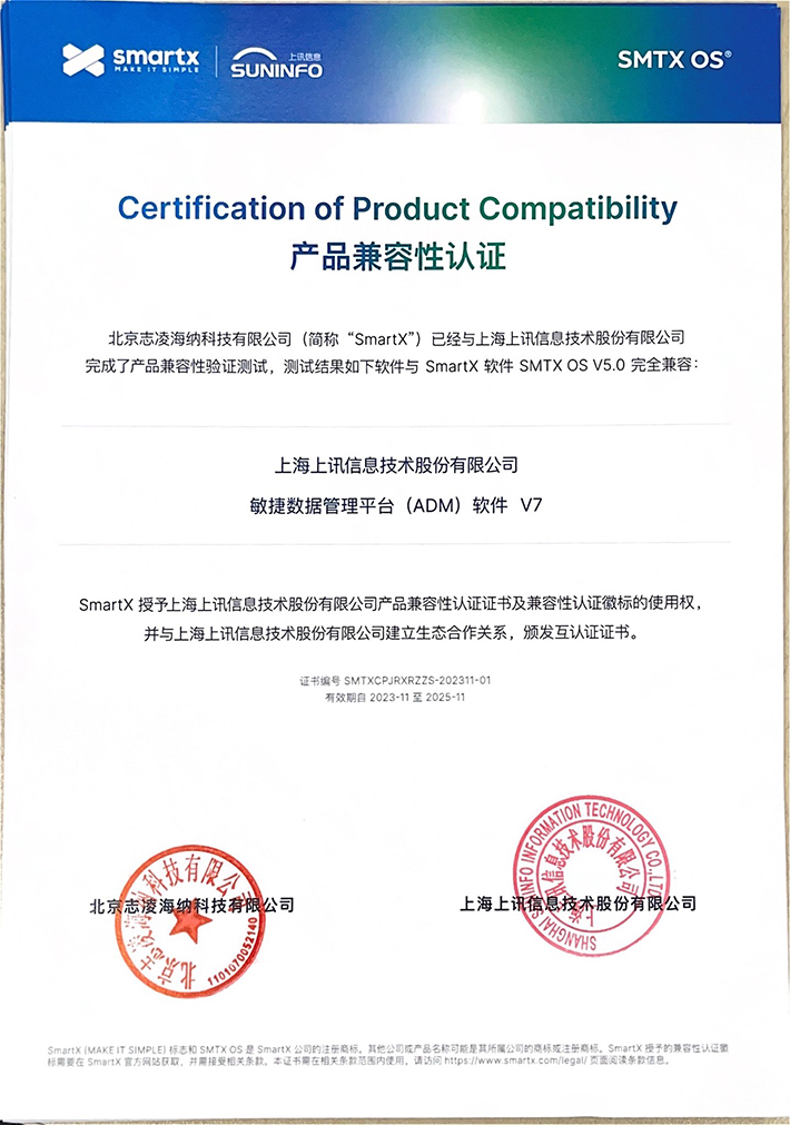 上讯敏捷数据管理平台 (ADM) 软件 V7与SmartX 软件 SMTX OS V5.0兼容性认证
