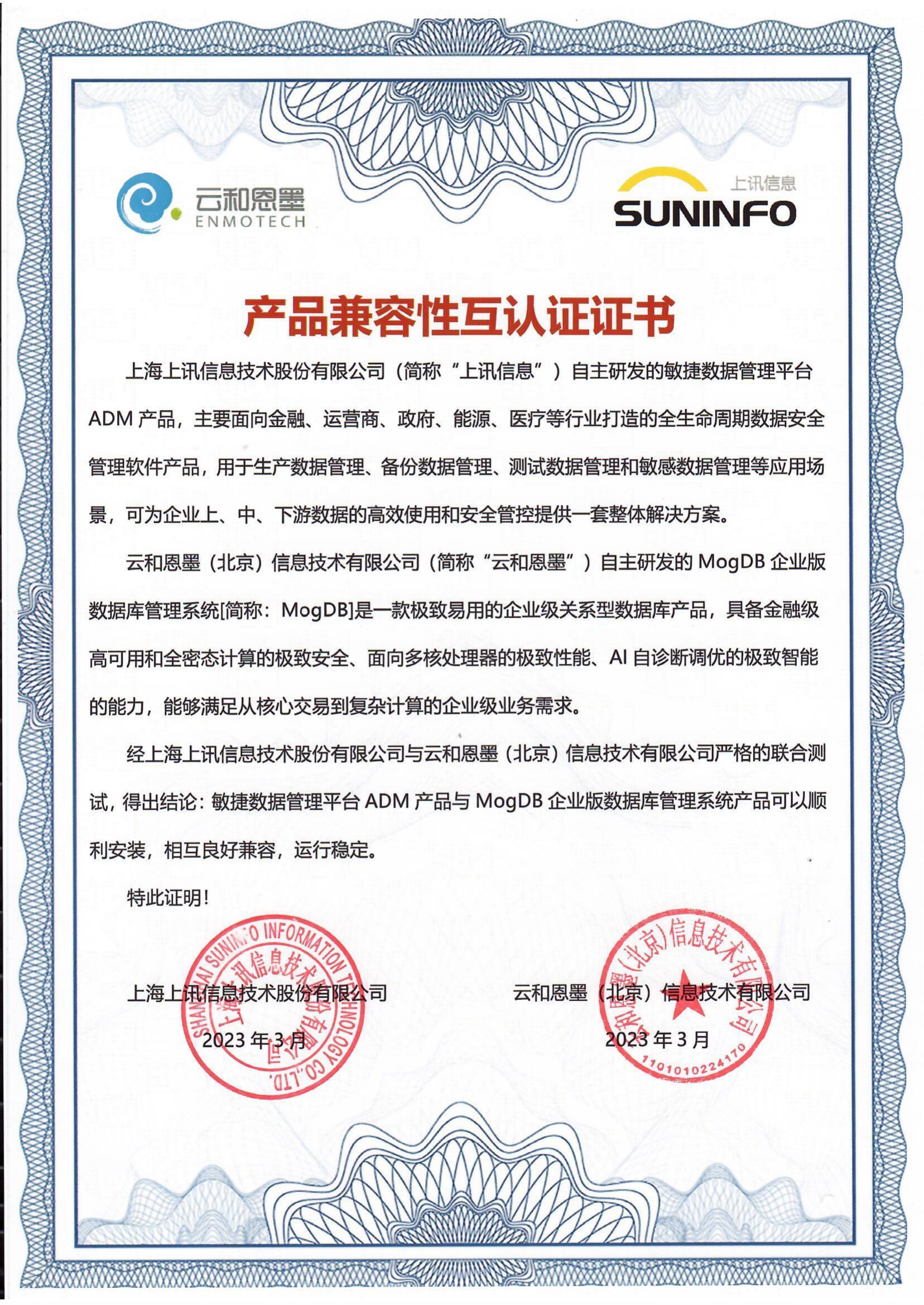 云和恩墨MogDB数据库产品兼容适配认证证书